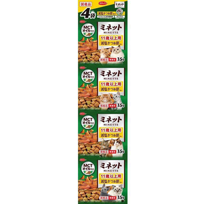 スマック ミネット 11歳以上用減塩かつお節添え 35g×4連パック 一般な油に比べて消化・吸収の早いMCTオイルを配合。若々しい身体作りをサポート。 トッピング量たっぷり。11歳以上の高齢猫に配慮。シニア猫にも食べやすい小粒タイプ。※商品は数量によりますが、6個までレターパックプラス(600円)でも送ることができます。ご注文の際は配送方法に『レターパックプラス便』をお選びください。