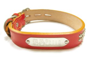 ※定形外郵便対応で1本送料390円になります。 ※但し郵送の際は、パッケージより取り出し画像のように丸くして包装いたします。 ご注文の際には『定形外郵便・規格外』を選択してください。 ★鋲(びょう)付平首輪 サイズ24mm 首周り32cm〜39cm 適応体重7kg〜10kg 素材 牛皮革