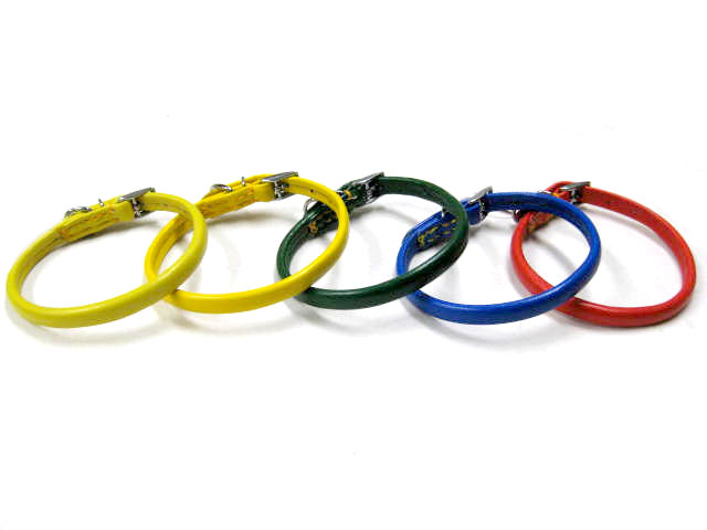 【サイズ】 幅0.8cm×全長34cm 【首回り】 25.5cm〜30cm 【適応体重】5kg以下 【材質】 牛皮 【カラー】 レッド、ブルー、グリーン、イエロー(レモンイエロー、山吹色)